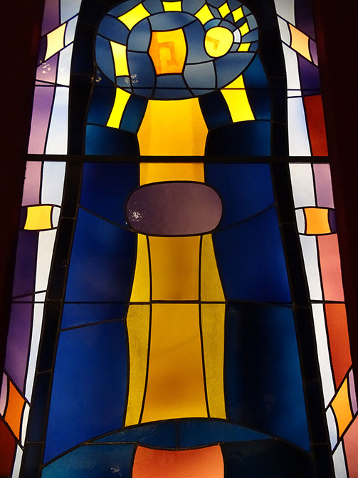 Madonna. Moderne Darstellung der Maria. Glasgemälde von Fritz Weigner und Heinrich Mäder, Zürich, 1956.