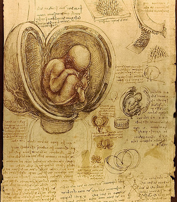Leonardo da Vinci (1452-1519). Fötus in der Gebärmutter, Studie 1510-13. WikiCommons. Foto Luc Viatour.