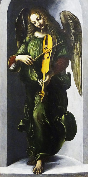 Leonardo da Vinci (ev. Associate Francesco Napoletano). An Angel in Green with a Vielle, 1490. National Gallery London.