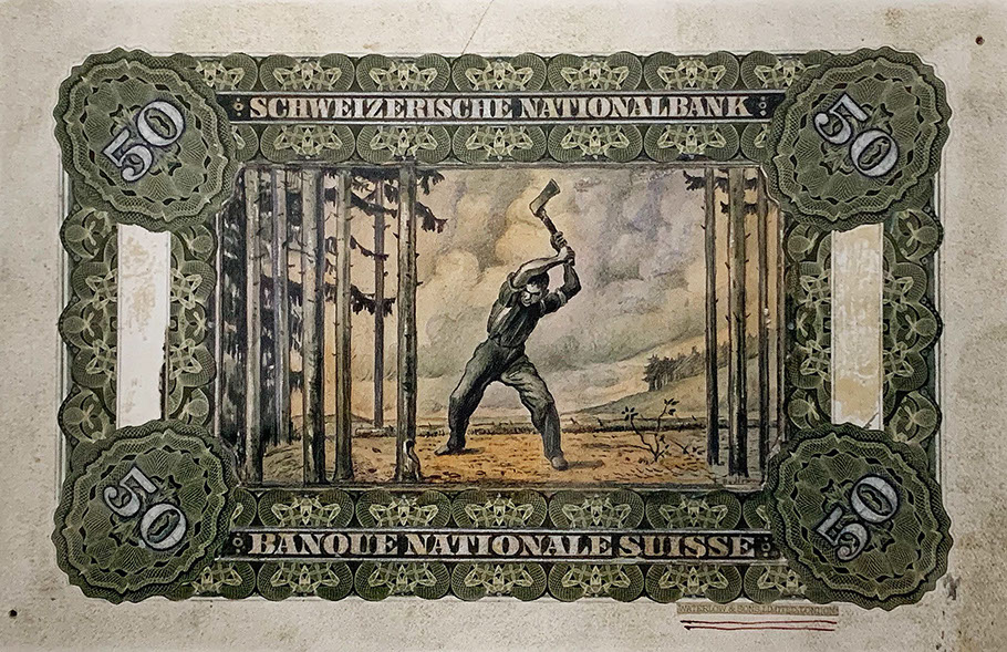 Ferdinand Hodler (1853-1918). Der Holzfäller auf der 50-Franken-Banknote 1911-1958. Schweizerische Nationalbank.