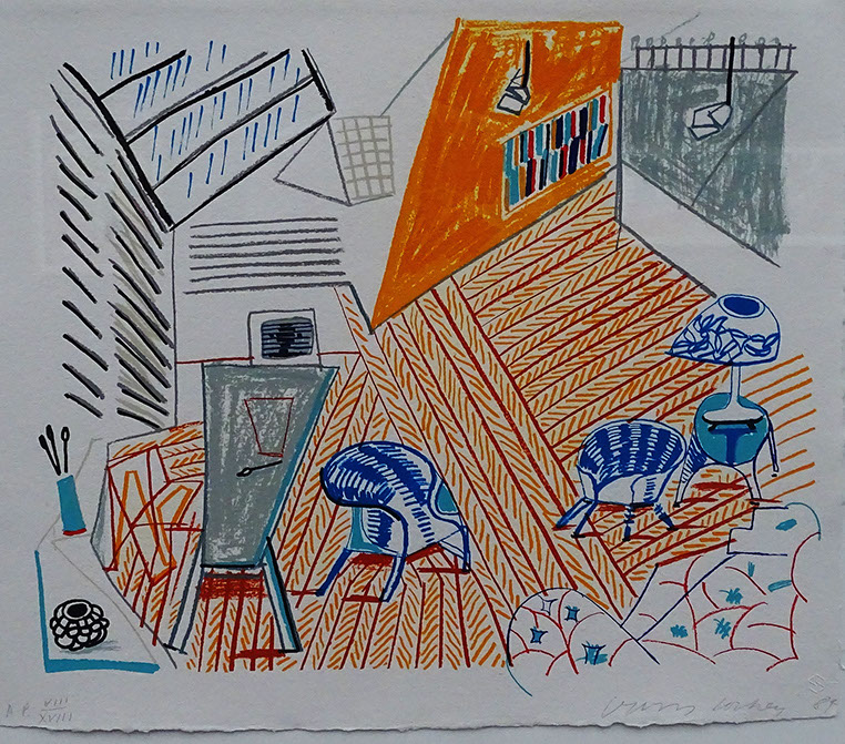1984-David Hockney (1937). Pembroke Studio with Blue Chairs and Lamp, 1984. Tate London.