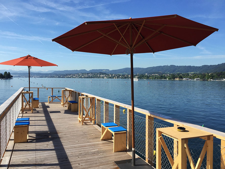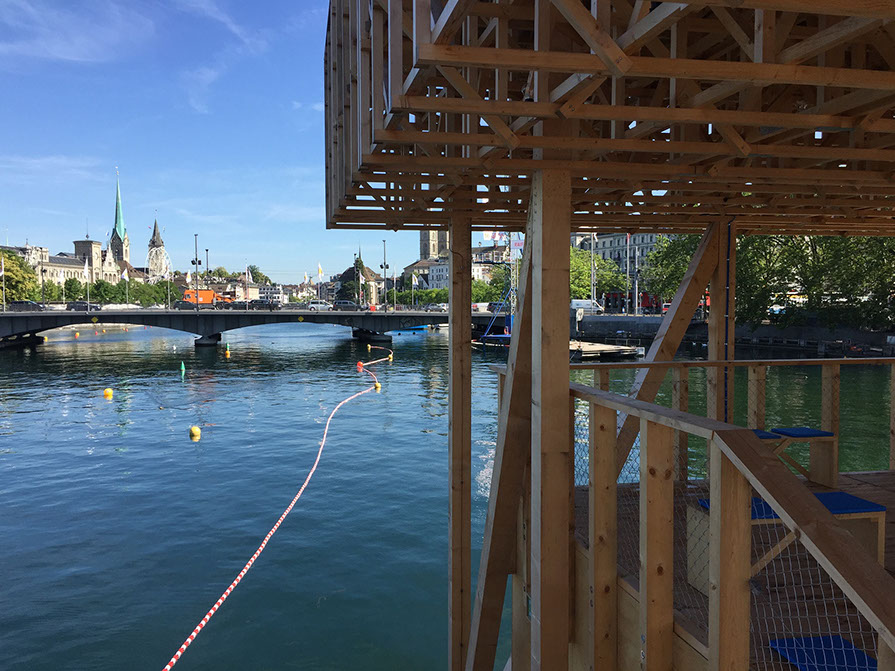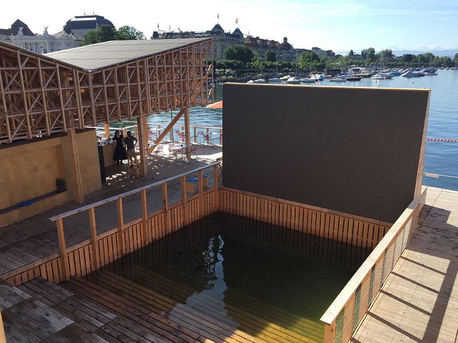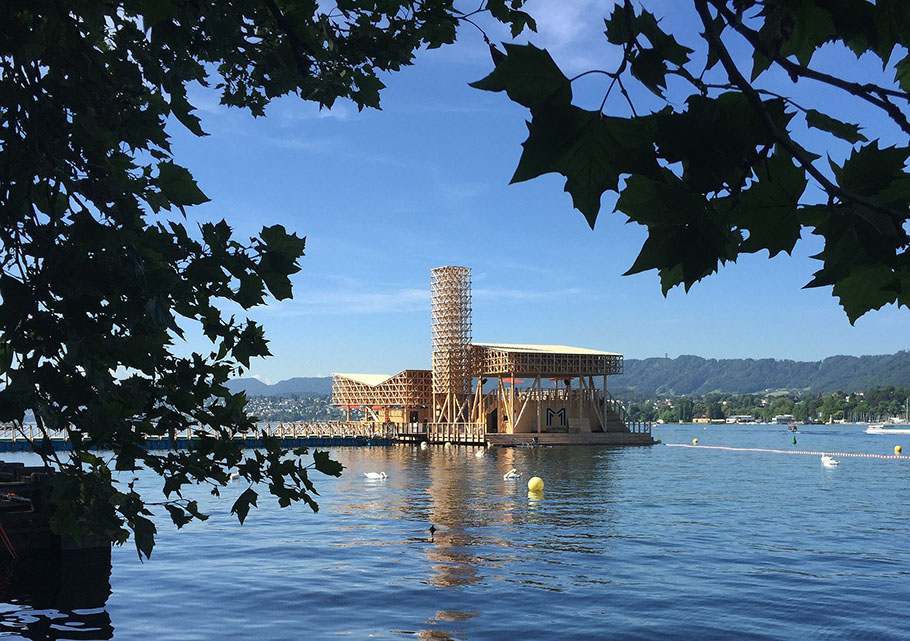 «Pavillon of Reflections», der schwimmende Treffpunkt auf dem Zürichsee mit Kino, Bar, Schwimmbad und Auditorium lädt die Besucher ein, über die Kunstwerke nachzudenken.