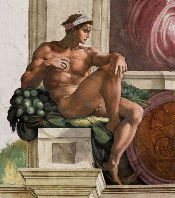 Michelangelo (1475-1564). Nackter Jüngling, 1508-1512. Sixtinische Kapelle, Rom. Foto Jörg Bittner Unna, WikiCommons.