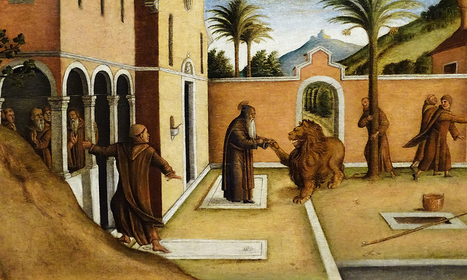 Lazzaro Bastiani (1430-1512). Storie della Vita di San Girolamo. Girolamo che porta il Leone al Convento, 1485.