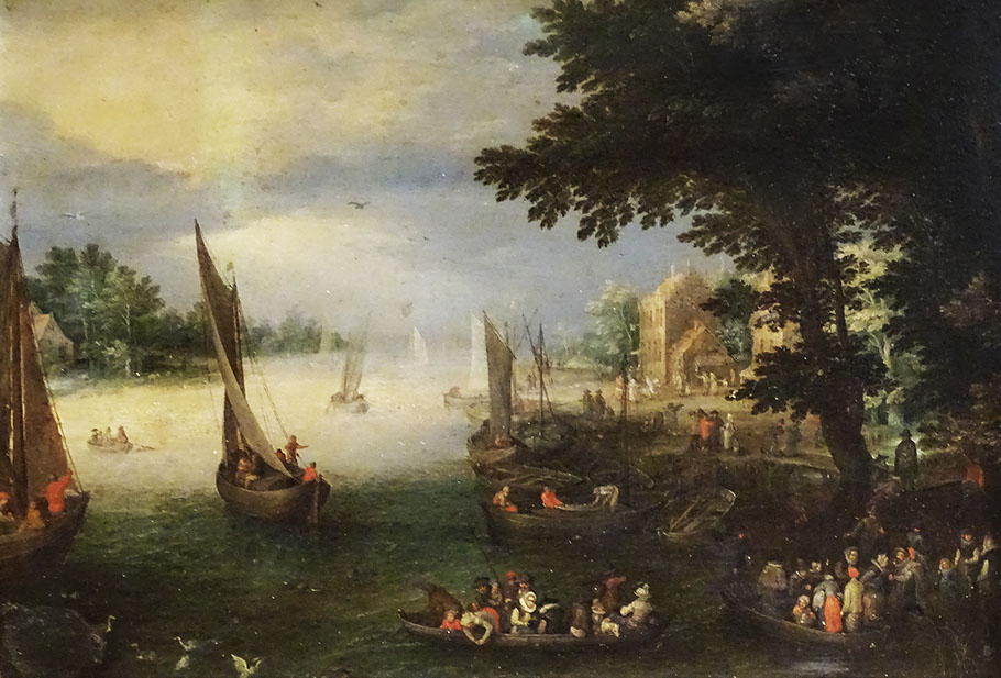 Jan Brueghel d.J. (1601-1678). Paesaggio fluviale con imbarcadero, ca. 1650. Pezzoli Milano.