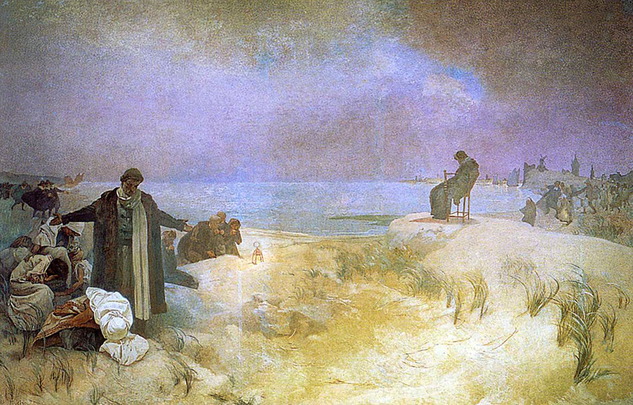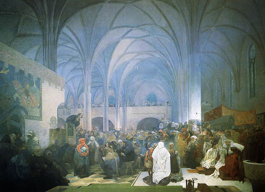 1916-Alfons Mucha (1860-1939). Jan Hus predigt in der Kapelle Bethlehem, 1916. Mucha Museum Prag.