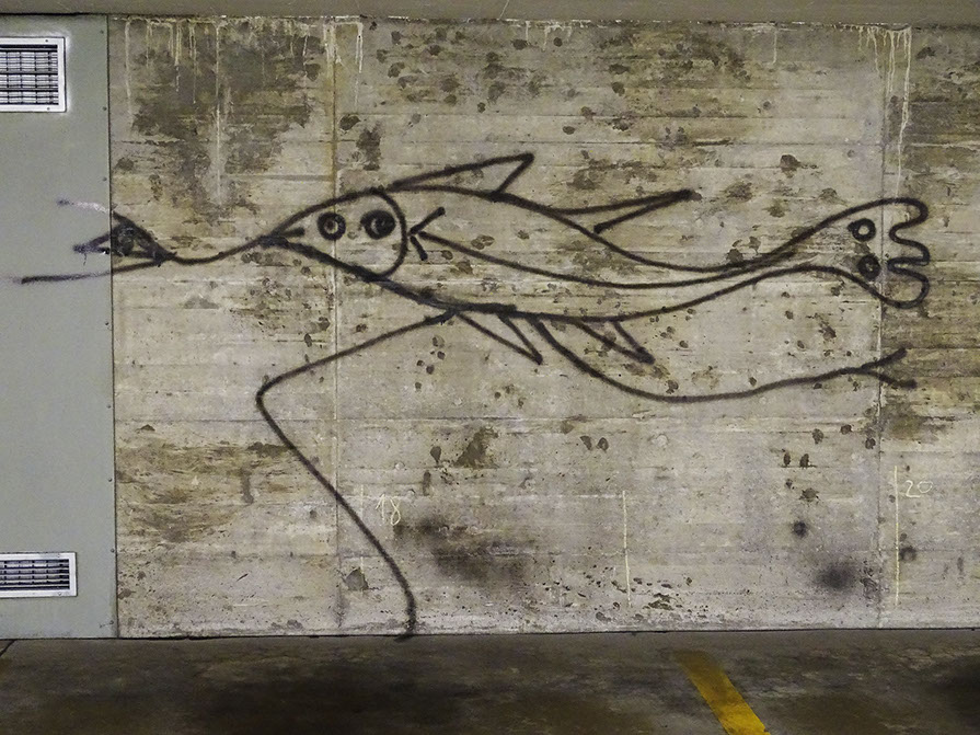 Harald Naegeli (1939). Fisch 2017, Rheinkniebrücke, Parkplatz, Düsseldorf. Foto Jula 2812, WikiCommons.