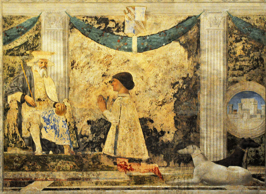 Sigismondo Pandolfo Malatesta before Saint Sigismund, 1451. Tempio Malatestiano, Rimini. Foto Henry Townsend, Wiki.