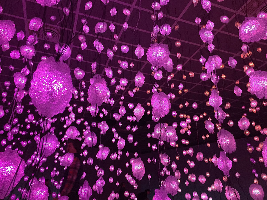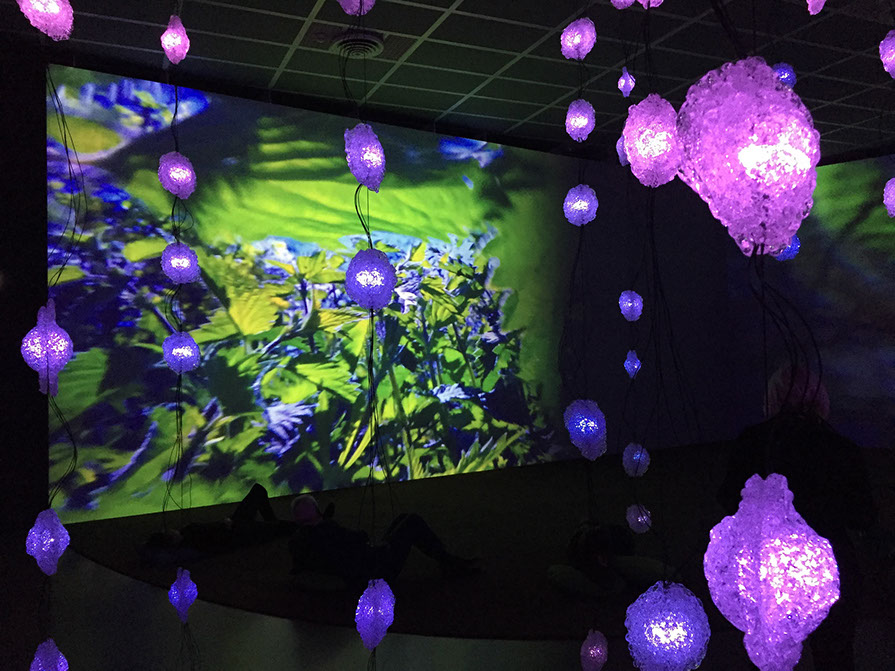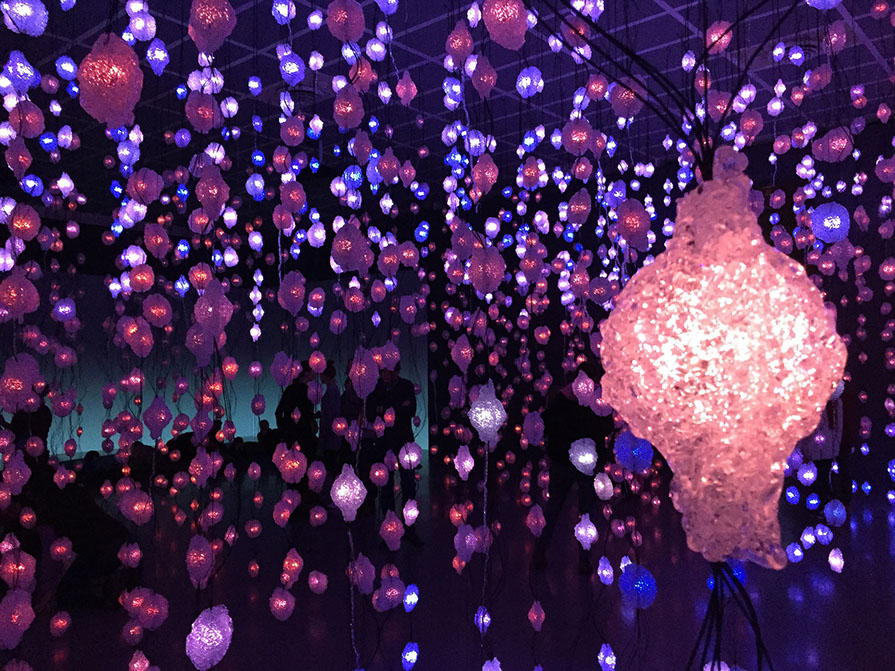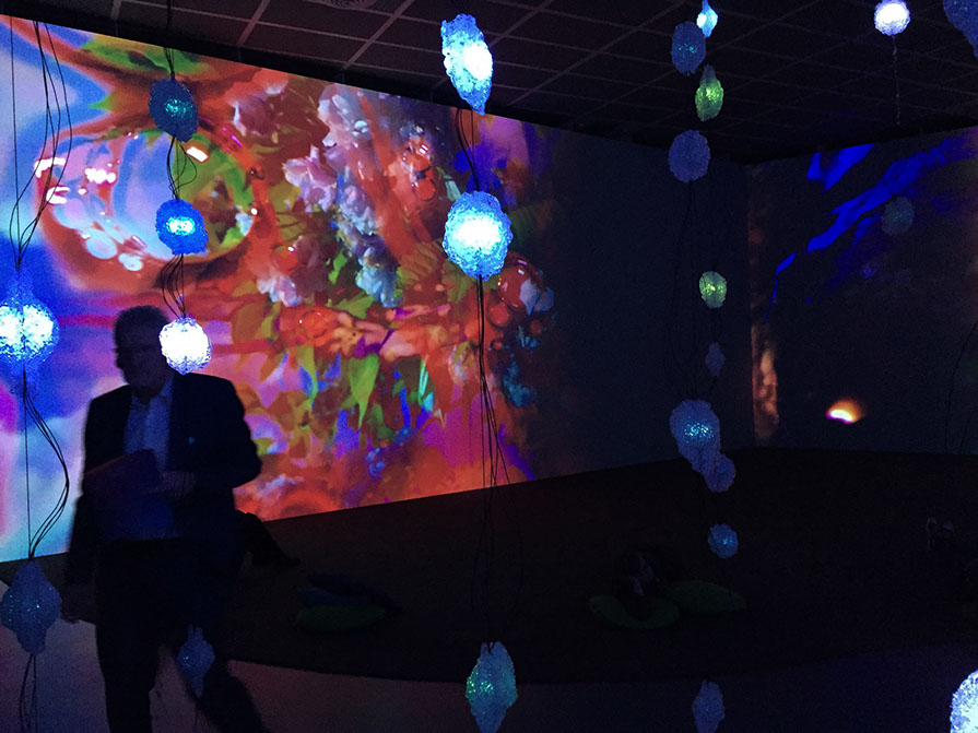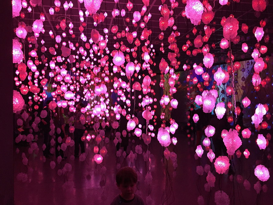 Im Pixelwald. Videoinstallation mit hängenden LED-Lichtern.
