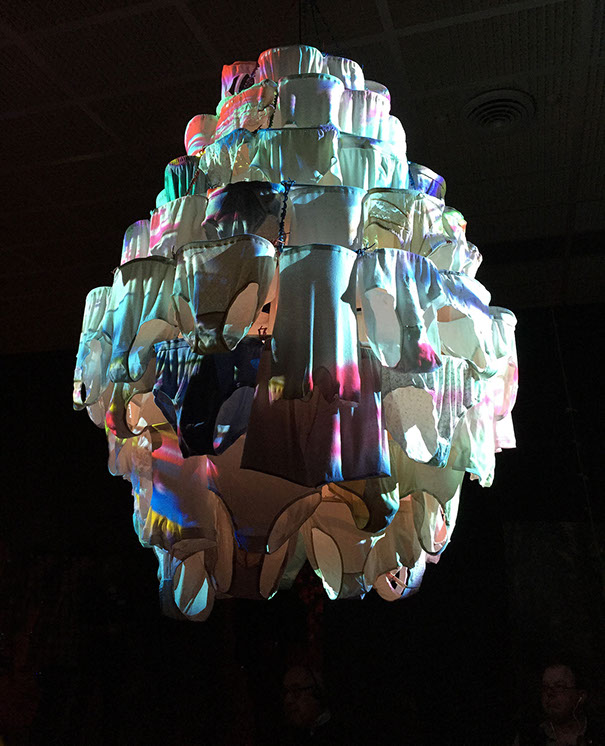 Cape Cod Chandelier – der Leuchter aus lauter Unterhosen, von zwei Projektoren angestrahlt.