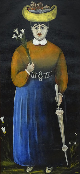 Niko Pirosmani (1862-1918). Frau mit Blumen und Schirm, Öl auf Wachstuch. Georgisches Nationalmuseum, Tbilissi.