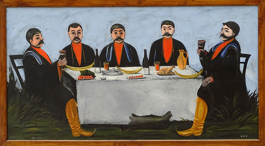 Niko Pirosmani (1862-1918). Gelage mit Leierkastenmann Datiko Semel, 1906. Georgisches Nationalmuseum, Tbilissi.