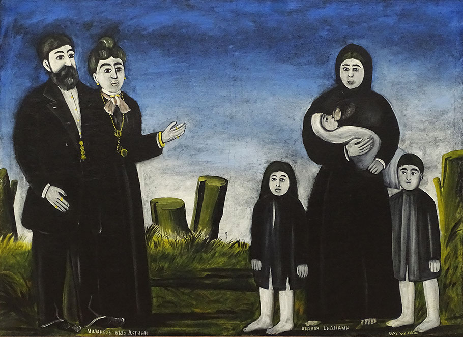 Niko Pirosmani (1862-1918). Kinderloser Millionär und arme Frau mit Kindern, Öl auf Wachstuch. Georg. Nationalmuseum.
