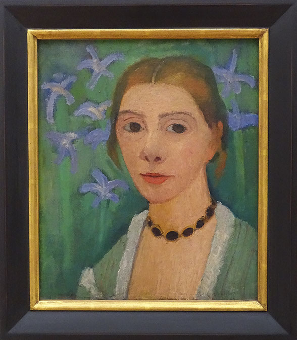 Paula Modersohn-Becker (1876-1907). Selbstbildnis vor grünem Hintergrund mit blauer Iris, 1905. Kunsthalle Bremen.