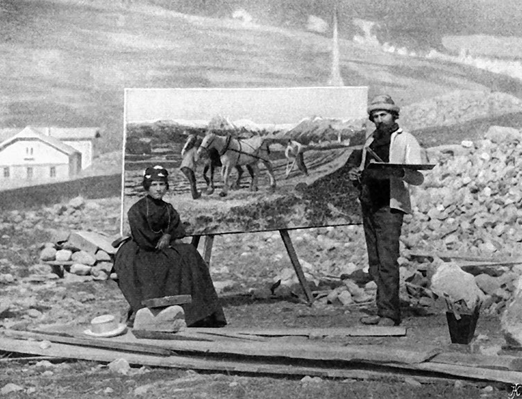 Giovanni Segantini (1858-1899). Giovanni und Bice Segantini vor dem Bild «Das Pflügen», 1888. Wiki Commons.