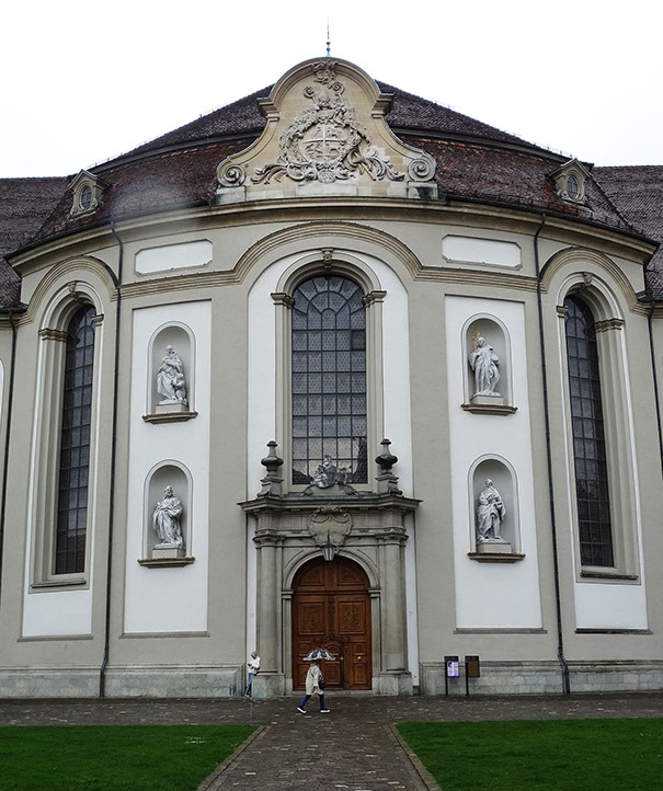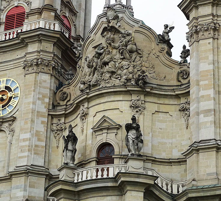 Hauptportal mit Rotunde. Patrone Gallus, Otmar, Desiderius und Mauritius.