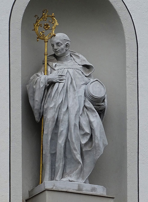 Otmar, der erste Abt des Klosters (719-759). Statue des hl. Otmar mit Weinfässchen.