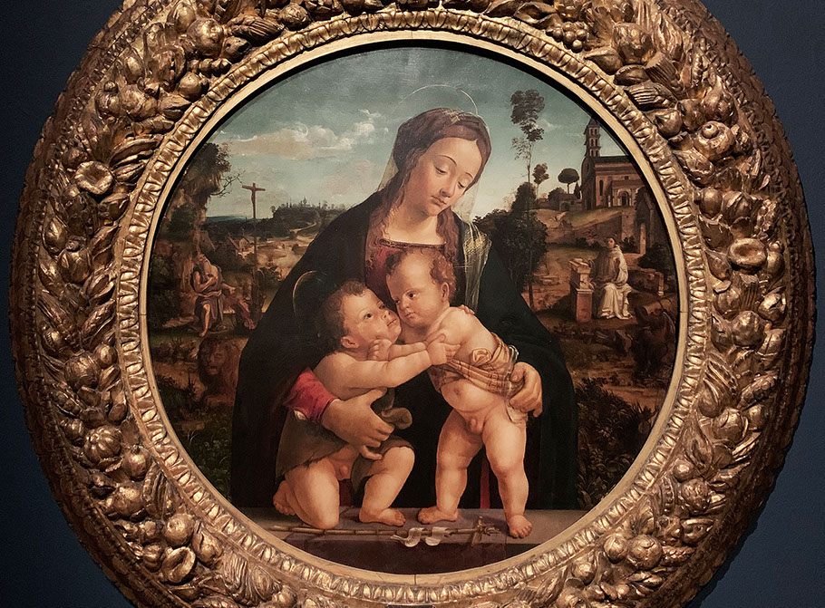 Piero di Lorenzo, dit Piero di Cosimo (1461-1521). La Vierge à l'enfant avec le petit saint Jean Baptiste.