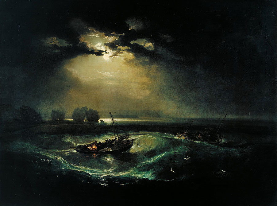 1831- Life-Boat going off to a stranded Vessel making signal (blue lights) of Distress, 1831. Detail. V&A Museum London.