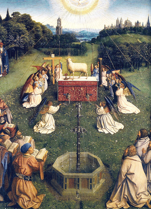 Hauptbild des Genter Altars: Das Lamm Gottes. Fotoquelle: closertovaneyck.kikirpa.be
