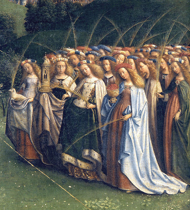 Genter Altar. Detail Hauptbild. Die Heiligen Jungfrauen. Fotoquelle: closertovaneyck.kikirpa.be