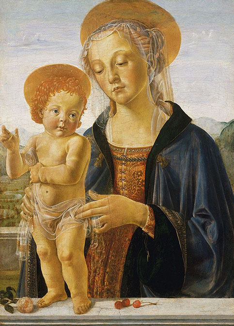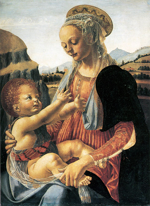 1470-Andrea del Verrocchio (1435-1488). Jungfrau mit sitzendem Kind, 1470. Ausschnitt. Gemäldegalerie Berlin.