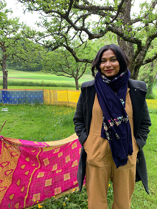 Ishita Chakraborty (1989) vor ihrem Zaun aus Saris, «The Songs of Resistence», 2023.