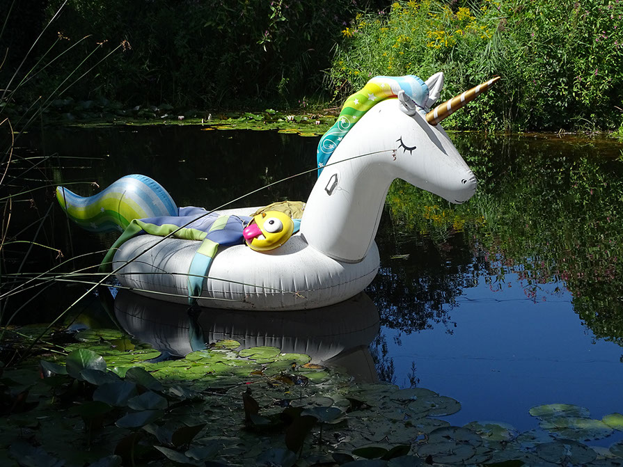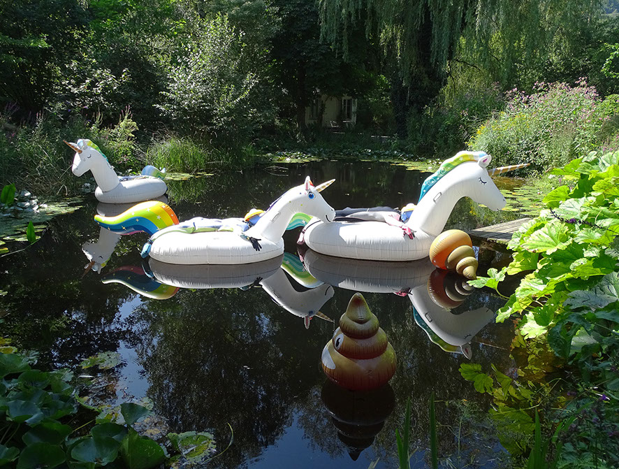 Olaf Breuning. Floating maniacs. PVR, Neopren, 2019. Einhorn und ausgeknockter Mann.