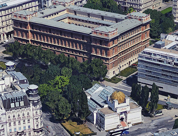 Akademie der bildenden Künste, Wien. Unten das Secessionsgebäude. Foto Google Earth.