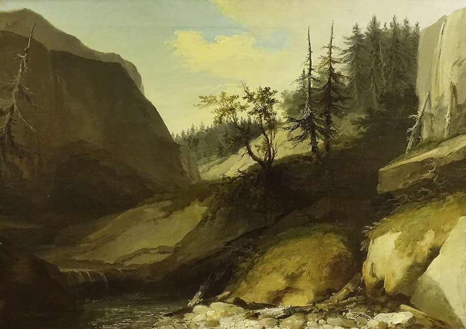 Caspar Wolf (1735-1783). Brücke und Dalaschlucht in Leuk, flussaufwärts gesehen, 1774-77. Musée d'Art du Valais Sion.