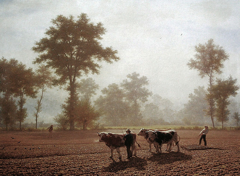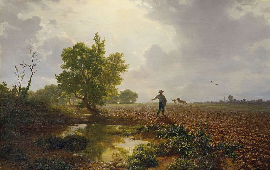 1868-Robert Zünd (1827-1909). Bauern mit Ochsengespann beim Eggen, 1868. Privatsammlung.