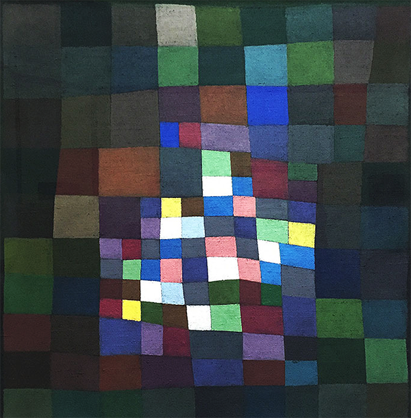 Auch >Paul Klee zerlegte Motive in geometrische Farbfelder wie Quadrate und Raster. Während seiner Bauhausjahre entwickelte Paul Klee rein abstrakte Kompositionen aus Farbquadraten und geometrischen Strukturen.