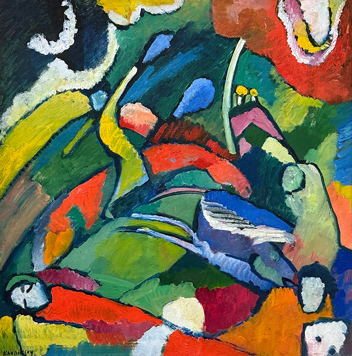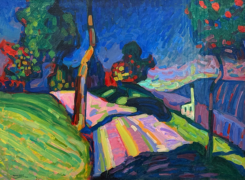 1908 löste sich Kandinsky dann von der natürlichen Abbildung. In «Murnau, Kohlgruberstrasse» zeigt sich das beispielhaft. Komplett reduzierte Formen, frei gewählte Farben (Bäume, Weg). Mit den Farben der Natur haben sie nichts mehr gemein.