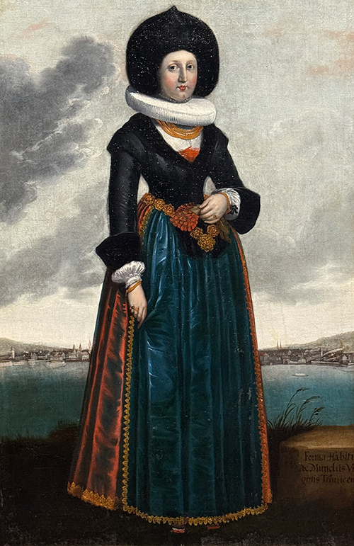 Sein Gemälde «Forma, Habitus ac Mundus Virginis Thuricensis» zeigt eine elegant gekleidete Frau in einer Zürcher Tracht. Dabei geht es um «Form, Körperhaltung und Schmuck» dieser «Zürcher Jungfrau». Der Künstler nimmt sich bewusst jedes noch so kleine Details vor, wodurch das Gemälde zu einem historischen Vermächtnis wird. Farbe und Qualität des Stoffs, Ornamente, Halskette, mehrere Fingerringe an beiden Händen. Und im Hintergrund detailliert zu erkennen die Zürcher Stadtmauer, das Fraumünster, der St. Peter und die beiden Grossmünstertürme, ja sogar das Bauschänzli.