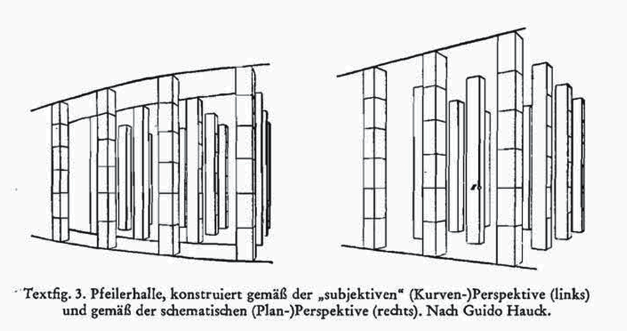 Pfeilerhalle, konstruiert gemäß der „subjektiven" Kurvenperspektive(links) und gemäß der schematischen Planperspektive (rechts). Nach Guido Hauck.