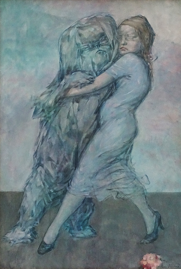 Valse bleue (1954) zeigt eine junge Frau, die eng umschlungen mit einem überdimensionierten Mops tanzt. Humorvolles und Melancholisches zu verbinden, ist ein Markenzeichen in Tannings Kunst. Der Mops ist möglicherweise inspiriert von Tannings eigenem Hund Katchina.