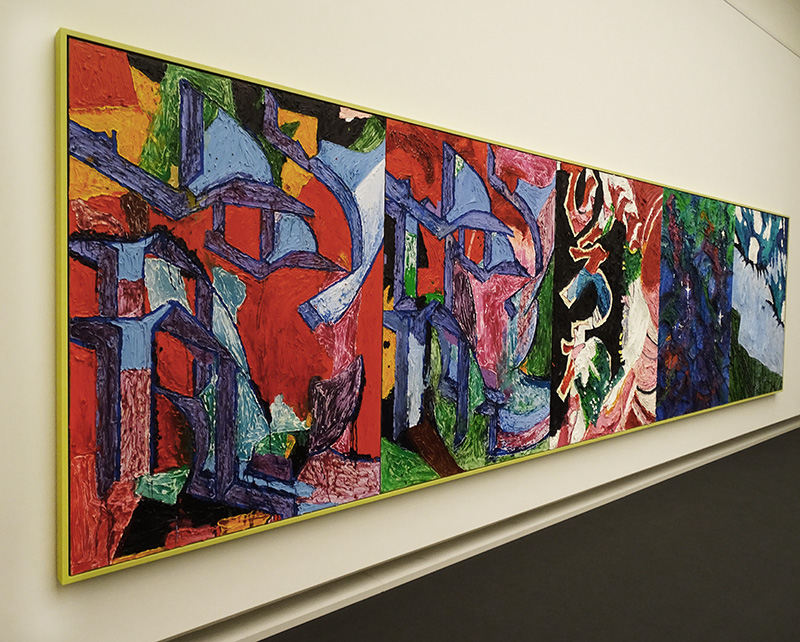In diesem Raum hing früher Claude Monets berühmtes «Bassin aux nymphéas, Le soir, 1916-22. Nun ist dort Ida Ekblads monumentaler Fries zu sehen, den die Künstlerin eigens für diese Ausstellung geschaffen hat. Sehr farbig, sehr abstrakt. Auch sein Titel «Their heads are wide and their eyes are lidless» ist ziemlich abstrakt. Vielleicht versteht man das besser, wenn man mehr über >Ida Ekblad liest?