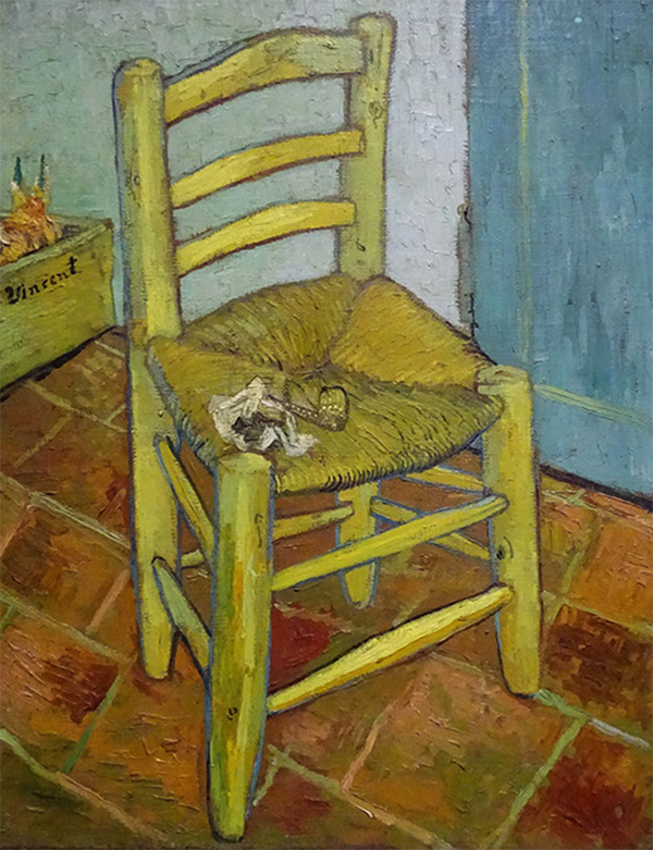 Schon vor der Ankunft Gauguins malte van Gogh einen leeren Stuhl mit dem Titel: «Gauguins Stuhl». Auf jenem befinden sich zwei Bücher und eine Kerze. Nun malt er den gelben Stuhl und diesmal platziert er auf diesem seine Pfeife und einen Tabakbeutel.