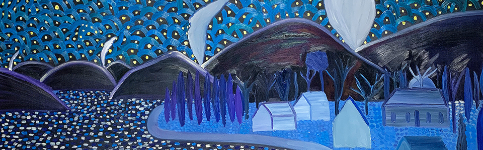 Das Gemälde ist aber auch punkto Malweise und Pinselführung interessant. Es ist eine Mischung aus Punkten und Farbklecksen (auf der linken Seite) und weist rechts dünne Linien auf, die stark an van Goghs «Starry Nigh» erinnern. Trotz knalliger Farbgebung ist eine melancholische Stimmung förmlich greifbar.