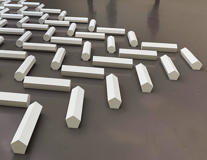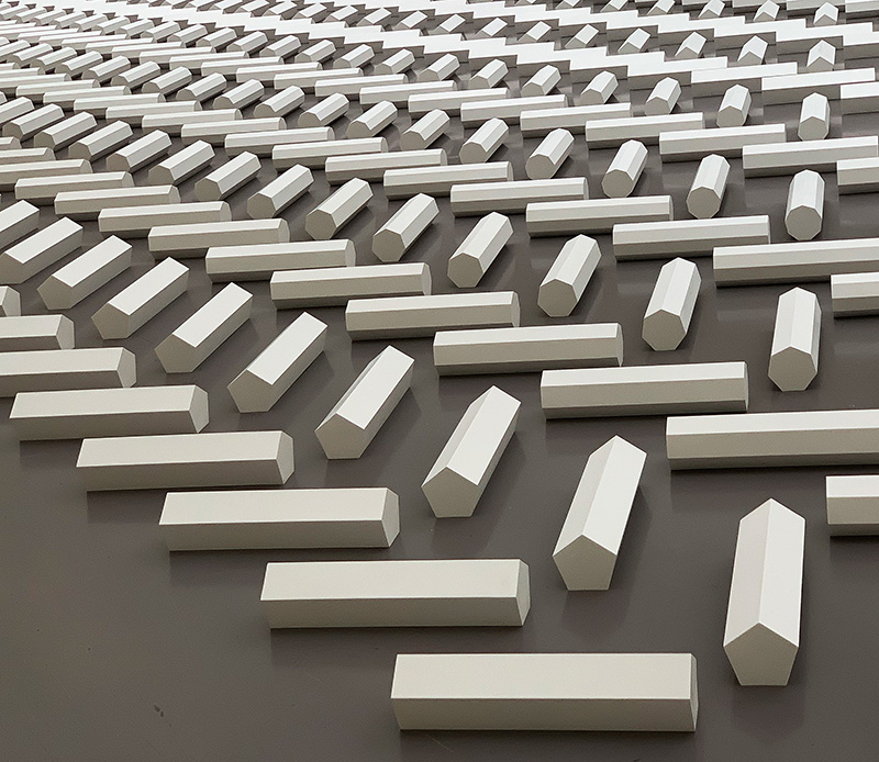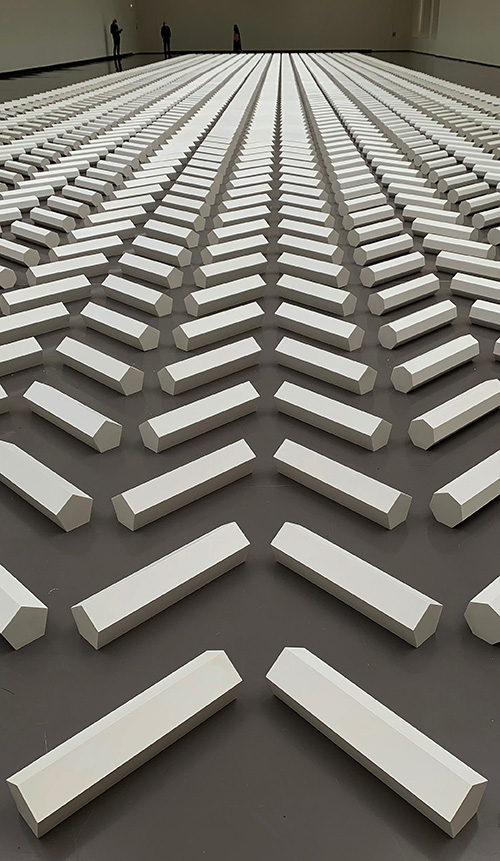 Die gewaltige Bodenskulptur – 20x50 Meter – besteht aus genau 2000 weissen Gipsbarren, alle 50cm lang, angeordnet in zwanzig Reihen zu je 100 Elementen. In einem mathematisch errechneten Rhythmus, deren Sinn sich nicht auf den ersten Blick erschliesst: 5-7-9-7-5-5-7-9-7-5. Die Zahlen erklären sich aus der Form der Gipsbarren, die fünf-, sieben- und neunkantig ausgefertigt sind.