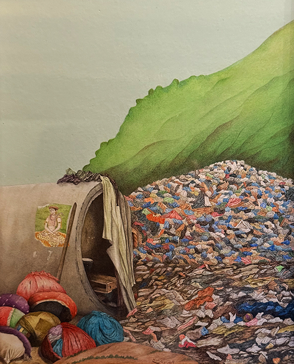 In dieser Arbeit stellt Malik in feiner Miniaturmalerei Müllberge im Gebirge dar. Sie ist beispielhaft dafür, wie junge pakistanische Künstler eine zeitgenössische Bildsprache entwickeln, die in ihrer eigenen Kultur verwurzelt ist, aber gleichzeitig globale Probleme thematisiert.