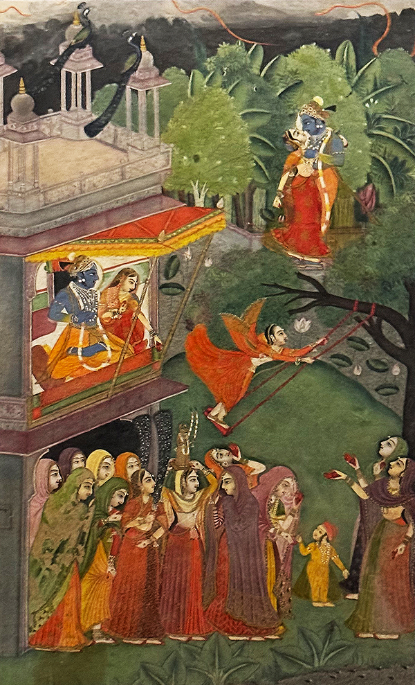 Sie erzählt die Story zwischen dem hinduistischen Gott >Krishna und dem Hirtenmädchen Radha. Das Bild zeigt die beiden in ihrer ersten Liebesnacht. Später erzählt Radha ihrer Freundin davon. Und erlebt dann ihre erste grosse Enttäuschung, als sie von ihrer Freundin erfährt, dass Krishna sich auch mit anderen Mädchen vergnügt.