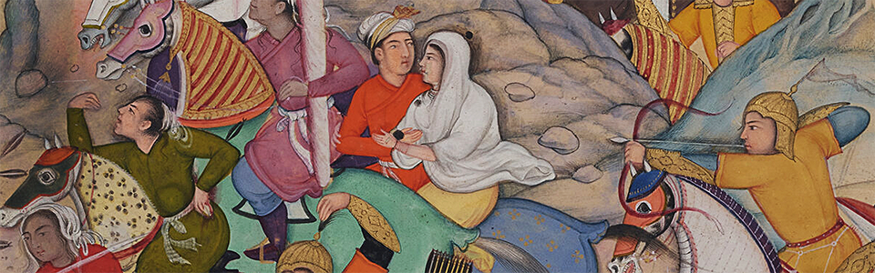 Dharam Das (zugeschrieben).Die flüchtende Begum wird angegriffen. Doppelseitiges Folio mit einer Szene aus dem «Chester-Beatty-British-Library-Akbarnama» Indien, 1593–1596. Museum Rietberg Zürich.