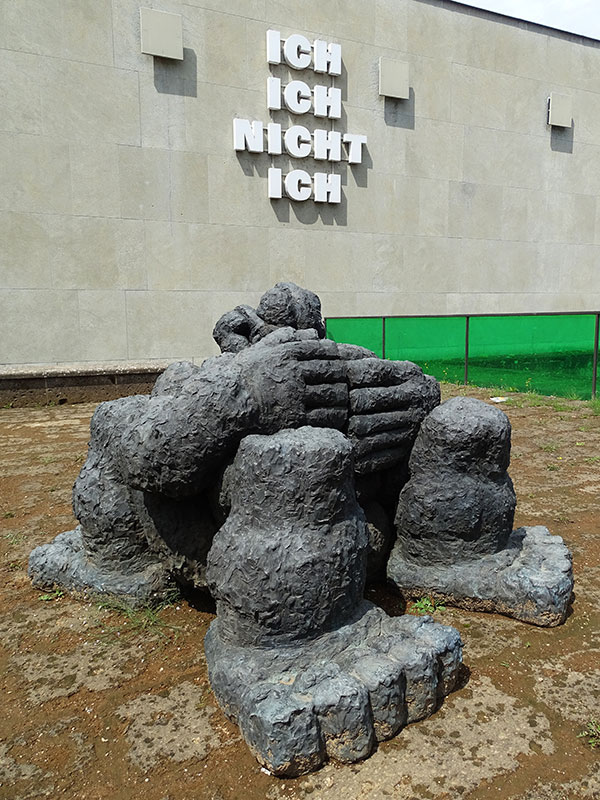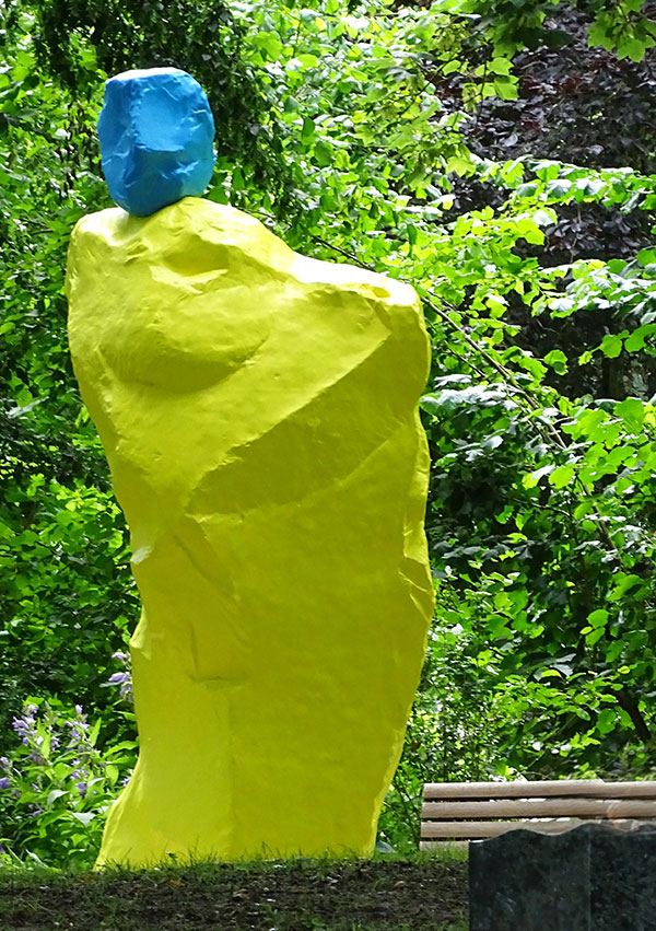 Dieses bunte Paar (Figur mit Tier) hebt sich davon doppelt ab: Erstens ist es keine Holzskulptur, sondern ein Werk aus bespraytem teufener Sandstein. Zweitens wird die surreal dargestellte kopflose menschliche Figur (mit vier abgetrennten Köpfen zu Füssen) von einer Art Krokodil mit Menschenkörper umart – zärtlich und liebevoll, vielleicht auch tröstend.