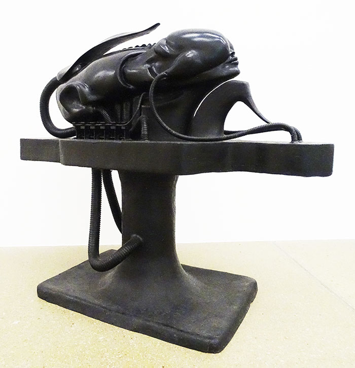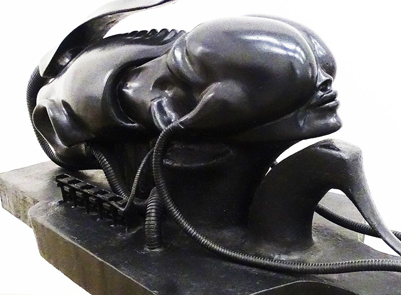 Zu Gigers Werk gehören auch Gebärmaschinen und Erotomechanics, ein Mix aus nackten Frauenfiguren und mechanischen Elementen, auch Waffen.