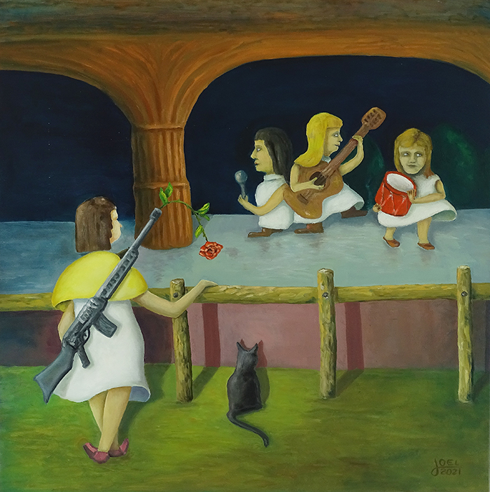 Wie im Bild «Die Koboldband». Stehen die Musikanten im Wasser? Ist das überhaupt Wasser? Und warum haben sie keine Beine? Und was soll die Frau mit der Kalaschnikov? Antworten gibts bei Joel keine. «Das soll jeder Betrachter mit sich selbst ausmachen», zieht er sich aus der Affäre. Und: «Ich mag halt schräge Dinge».