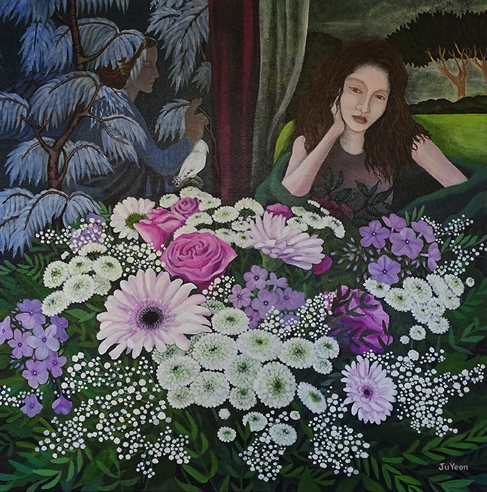 Doch da steckt mehr dahinter. Nämlich koreanische Volkskunst. «Minwha» nennt sie sich. In ihr soll sich der Wunsch nach einem glücklichen, harmonischen Leben manifestieren. Zahlreiche Symbole stehen dafür. Wie Vögel, die eheliches Glück bringen – wenn sie denn als Paar dargestellt werden. Und dann gibt es die zehn Symbole, die für ein langes Leben stehen. Dazu gehören Wasser, Wolken, Sonne, Berge, Felsen, Kraniche, Schildkröten, Hirsche, Kiefern, Pilze und Bambus. In ihrem Ölgemälde «Mädchen und die zehn Symbole» packt Juyeon gleich alle zehn mit rein. Und schlägt damit eine Brücke zu ihrer Heimat Südkorea.