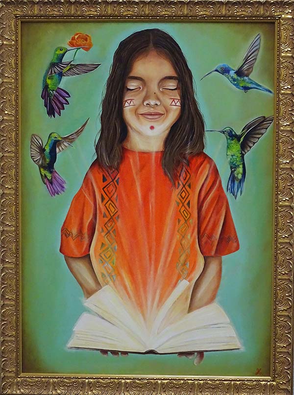 Ihrer Tochter Noelia widmet die Künstlerin gleich zwei Werke mit dem Titel Dschungel. Im ersten bildet sie Noelia mit geschlossenen Augen meditierend ab (oder im Traum aus einem Buch lesend?), während vier fliegende Kolibris das Mädchen umschwärmen.