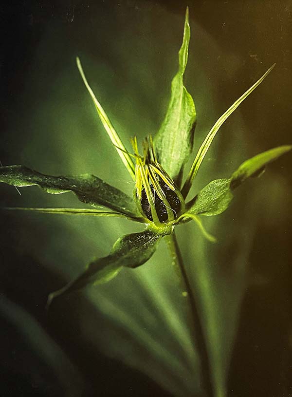 Bei Verborgen im Wald kommt Claudia Wintelers Leidenschaft für die Fotografie in spezieller Form zum Tragen: Sie sucht nicht nach der exklusivsten oder exotischsten Pflanze, sondern gibt auch einfachen Gewächsen eine Bühne. Wie dieser Einbeere, die im Dunkel des Waldes ihr Dasein fristet. Als echte Foto-Künstlerin lässt sie das unscheinbare Pflänzchen mit spärlichem Restlicht regelrecht aufblühen.