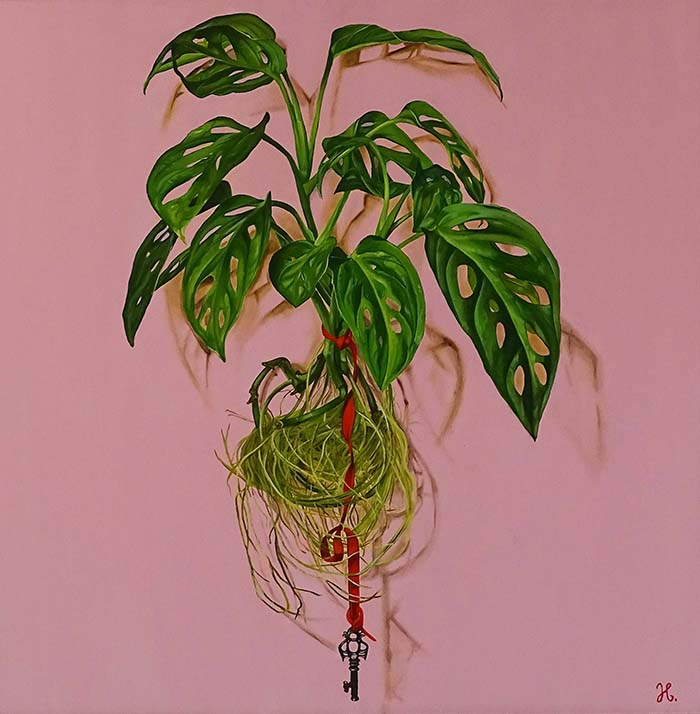 Das Ölgemälde Schlüssel zur Natur ist ihr neuestes Werk – sie hat es für diese Ausstellung «Power of Nature» geschaffen. Bei der Detailbetrachtung fällt sofort die feine Linienführung auf. Die scharfen Abgrenzungen würden zwar eher auf Acrylmalerei hindeuten, aber es handelt sich um ein Ölbild auf Malplatte. Auf die Frage, wie diese feinen Linien mit Ölfarbe zustande kommen, antwortet die Künstlerin: «Mit ganz viel Geduld».